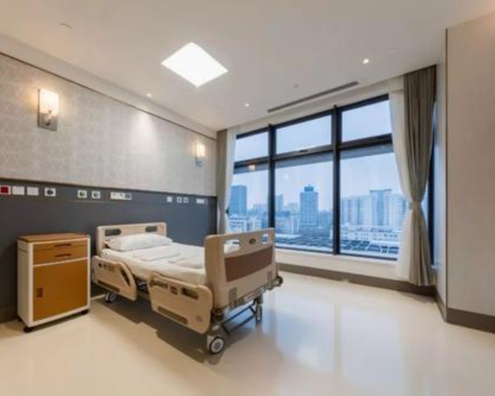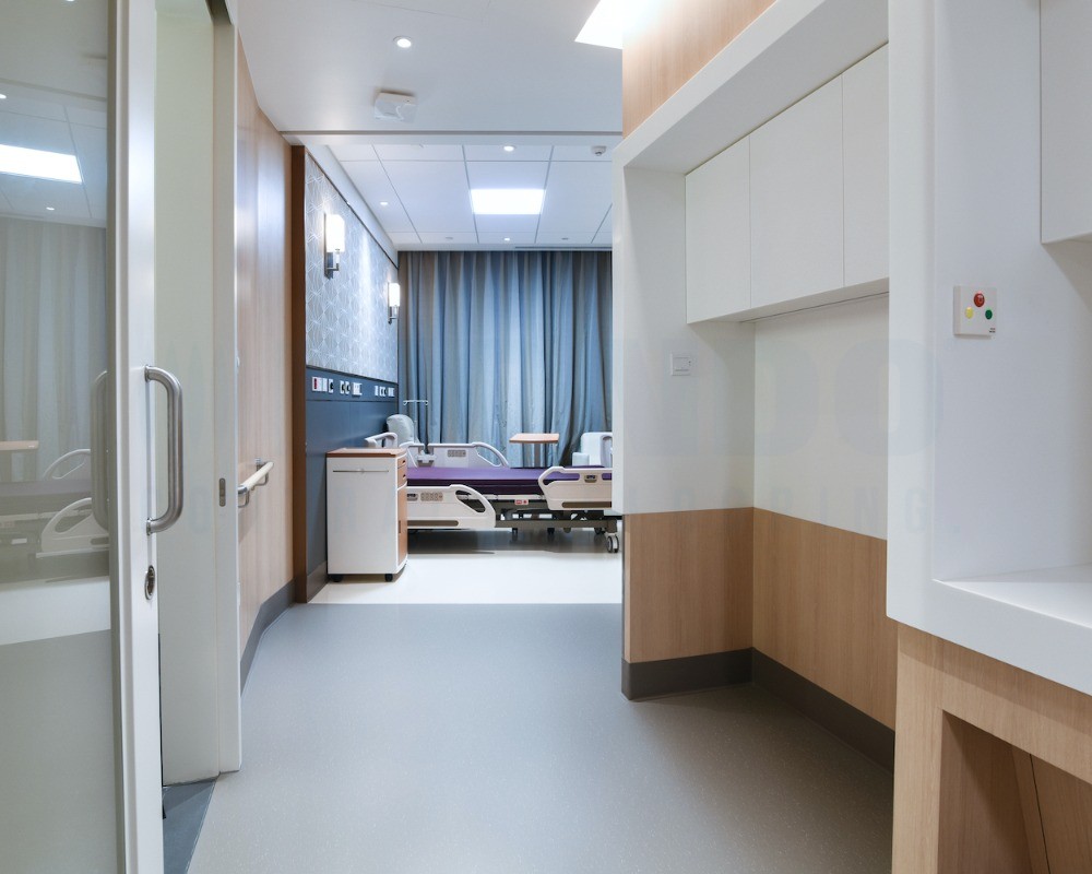 医院的标准层病房也采用全单间的设计。病房的入口呈小角度倾斜,为病人提供了一个更为安全的私密空间。MONDO盟多橡胶地板的大宽幅,足够病房入口通道所用,完整的一片式铺设,在呈现美观的同时也更便于医护人员进行清洁。