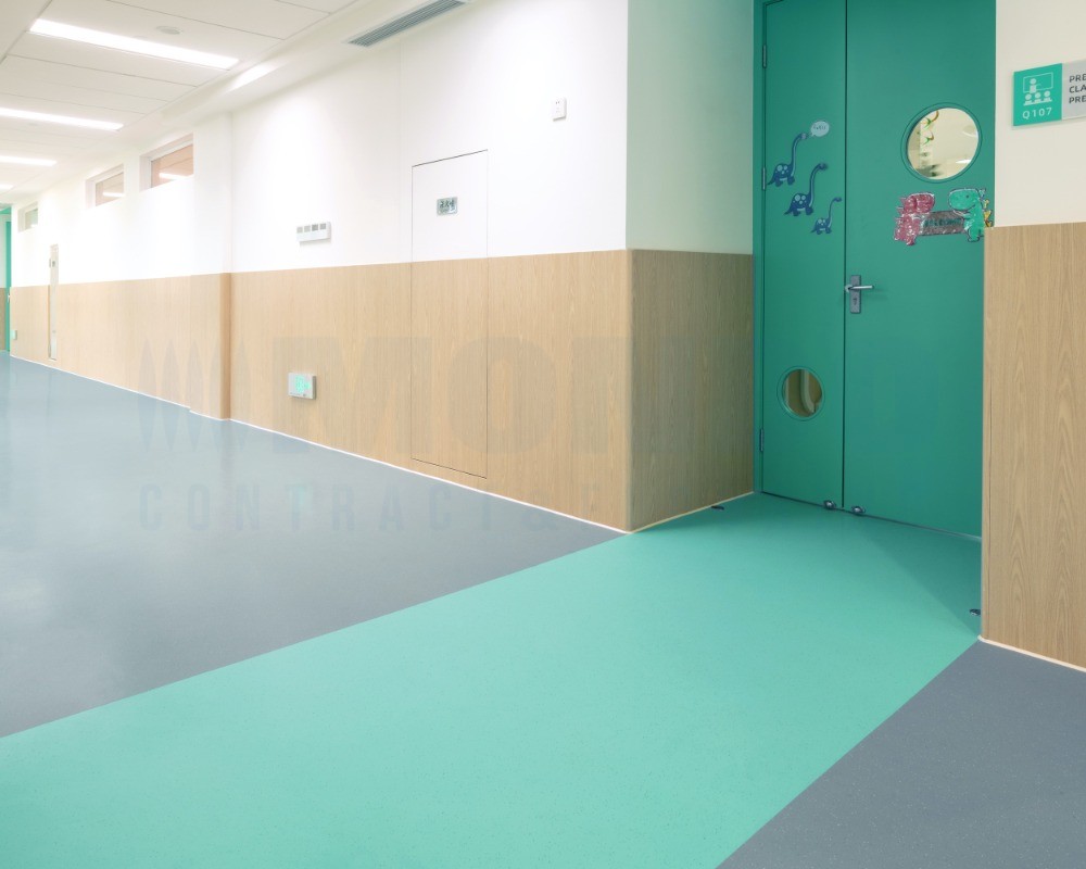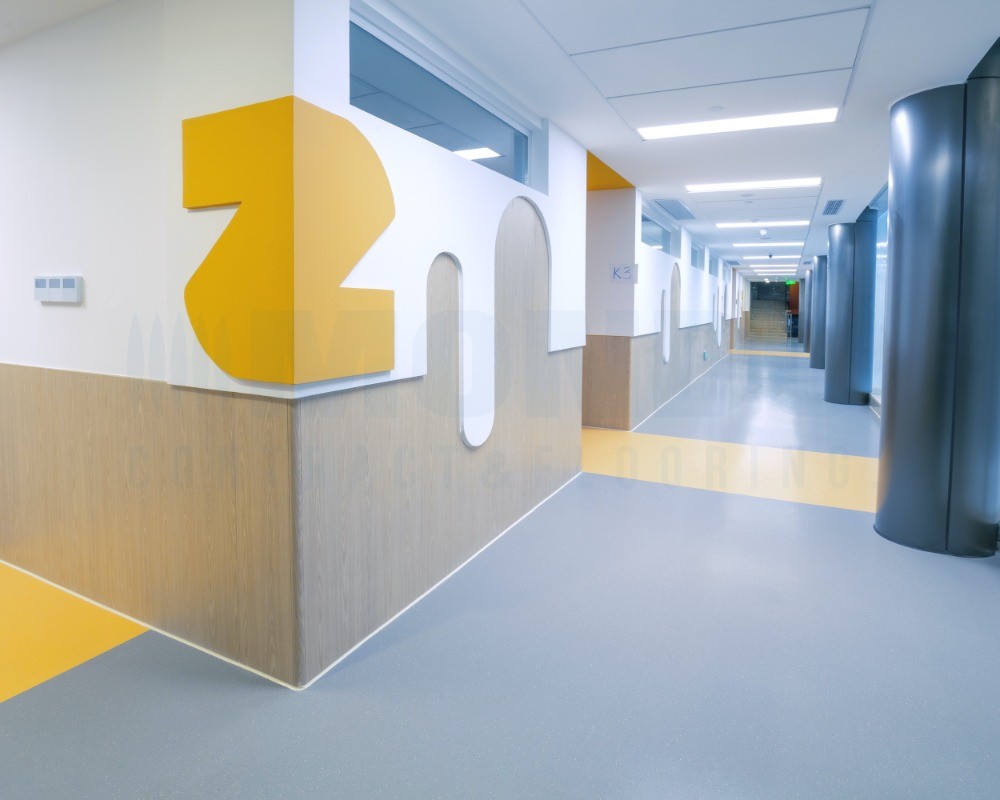 “深圳BASIS贝赛思双语学校使用Mondo盟多地板Punti多昂系列共计8个颜色,以丰富的色彩结合室内设计,为教学楼进行了合理分区,实现了功能与美观性的良好结合。”