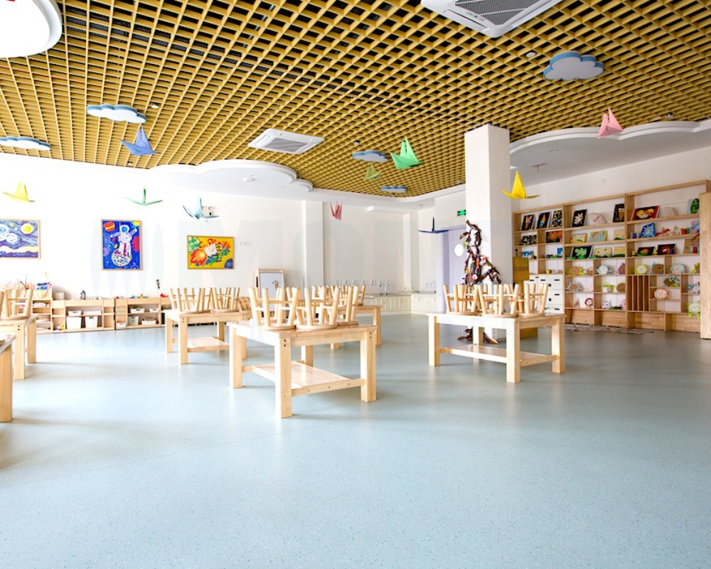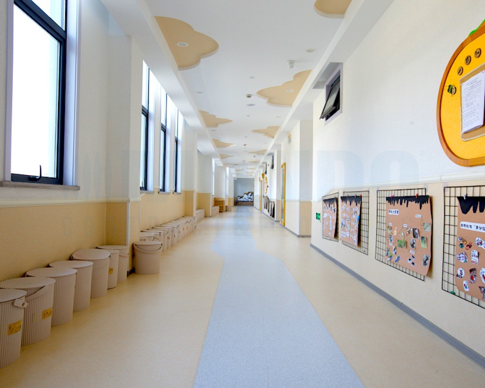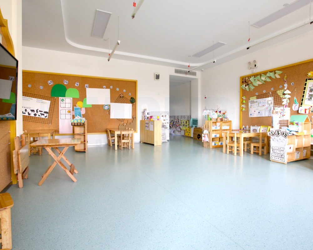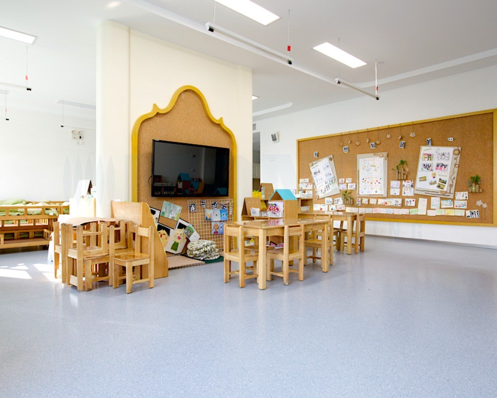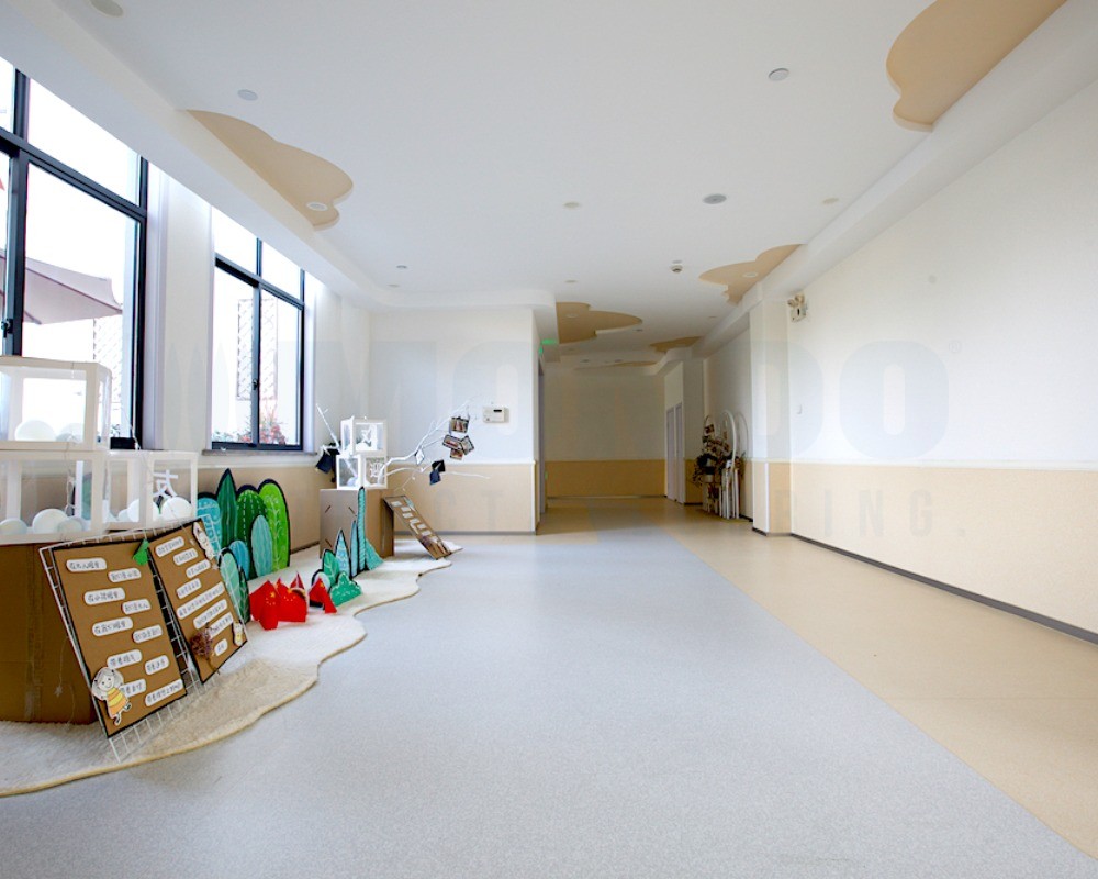 整体采用浅灰色系为主基调,不仅让室内空间显得通透开阔,更巧妙地衬托出幼儿园多彩的软装与教具,营造出宁静而不失活力的氛围。XT300康星系列以其优异的耐磨性和稳定性,确保了走廊、活动室等高流量区域的耐用与安全;而Pixel康赛系列则凭借丰富的色彩层次和细腻纹理,为空间增添了灵动质感。
