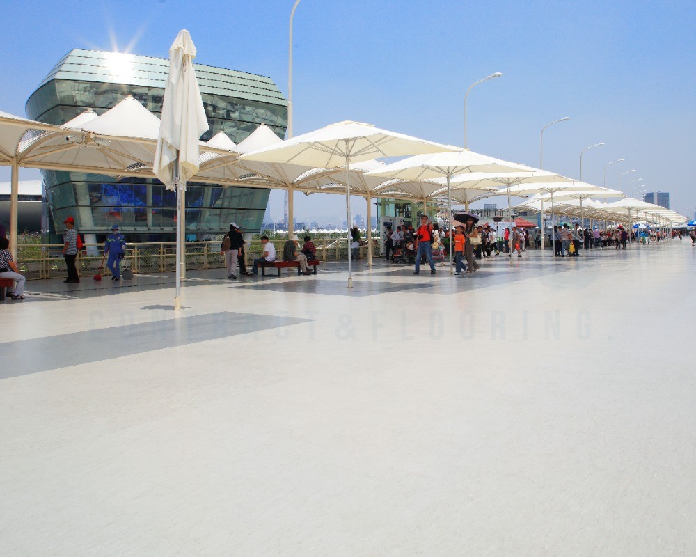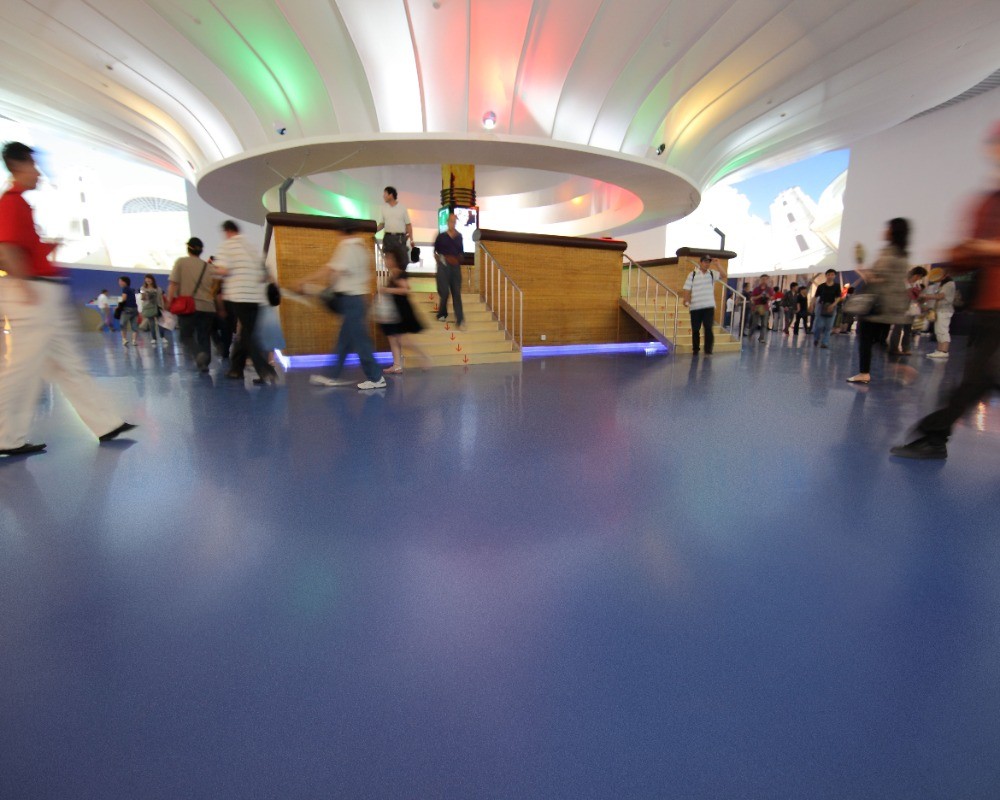 盟多PVC地板充分发挥其T级耐磨特性,从容应对世博会期间每日数以万计的超高人流与频繁的物流辗压,确保地面始终平整如新。其独特的吸音降噪性能,有效吸收了展馆内的人流嘈杂声,为游客营造了相对舒适的观展环境。面对室外公共区域复杂的天气与卫生挑战,盟多PVC地板不仅具备出色的防水防滑性能保障行人安全,其致密无孔的PUR表面处理工艺更使污渍难以渗透,极大降低了超大空间在高强度使用下的清洁维护成本。