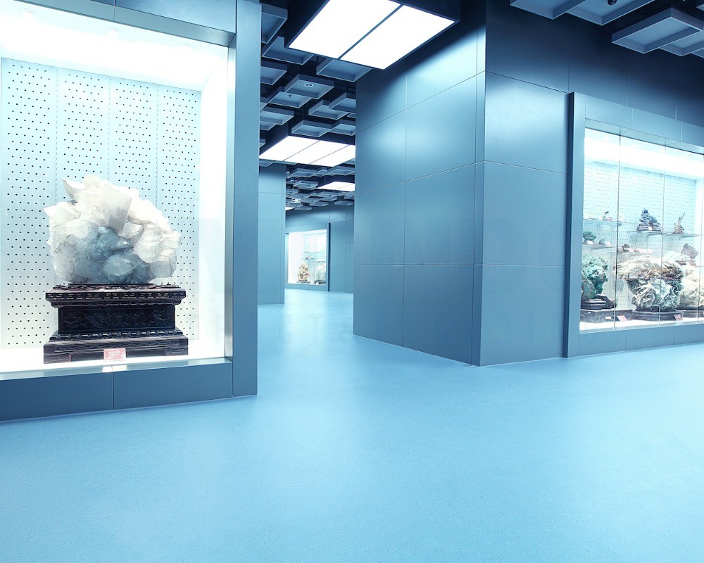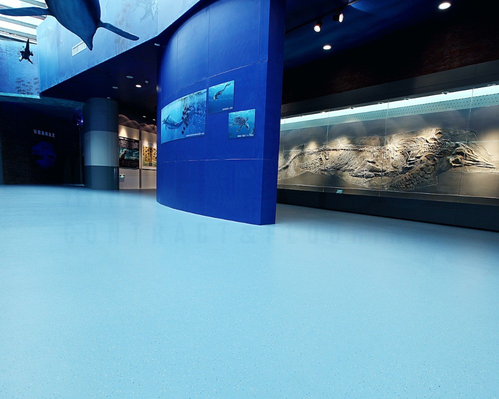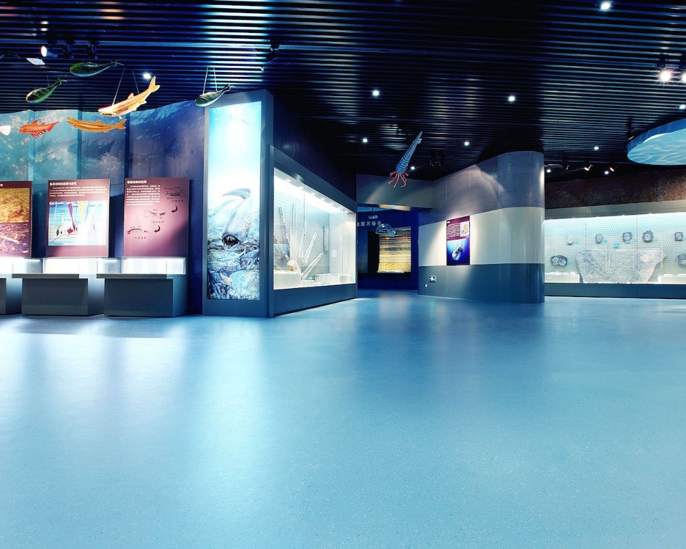 在合肥古生物博物馆项目中,盟多铺设了3mm厚的Futura多特系列橡胶地板,铺装面积为3000平方米。地面采用浅蓝色,与馆内古生物化石展陈主题及空间色调形成视觉协调。