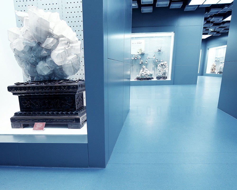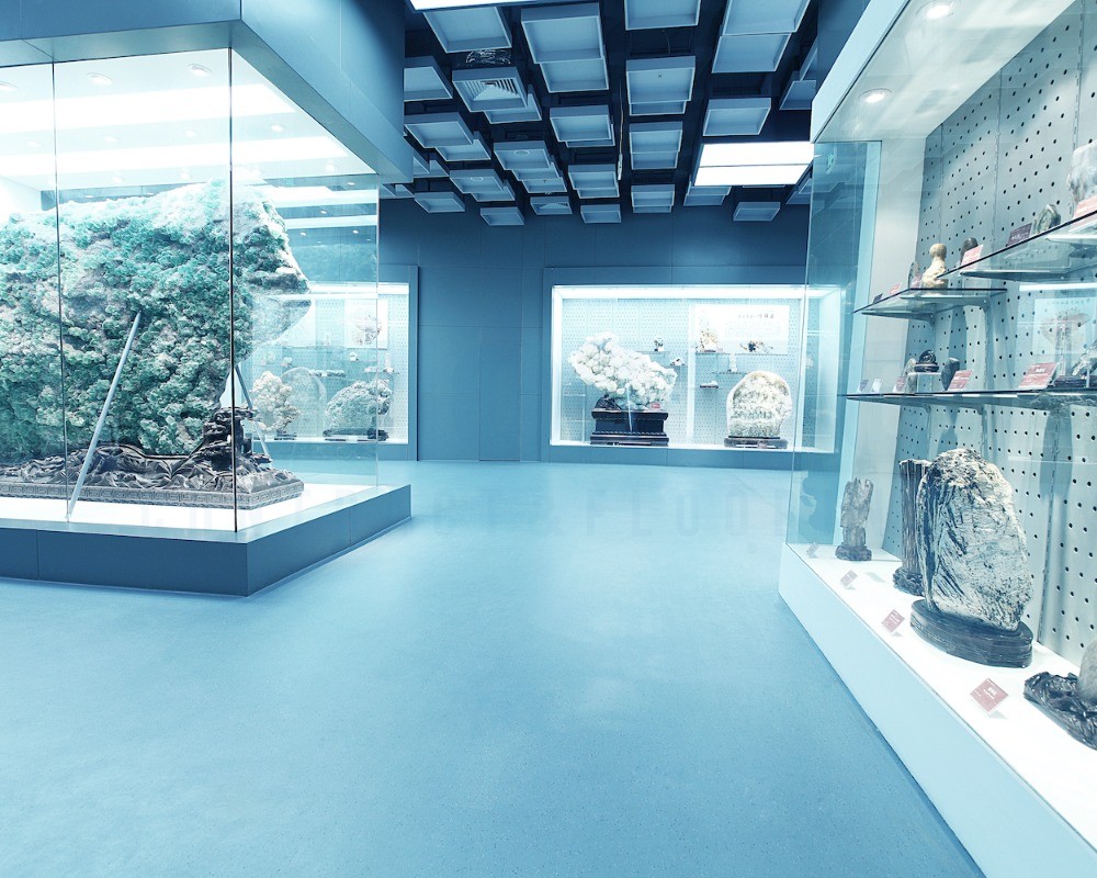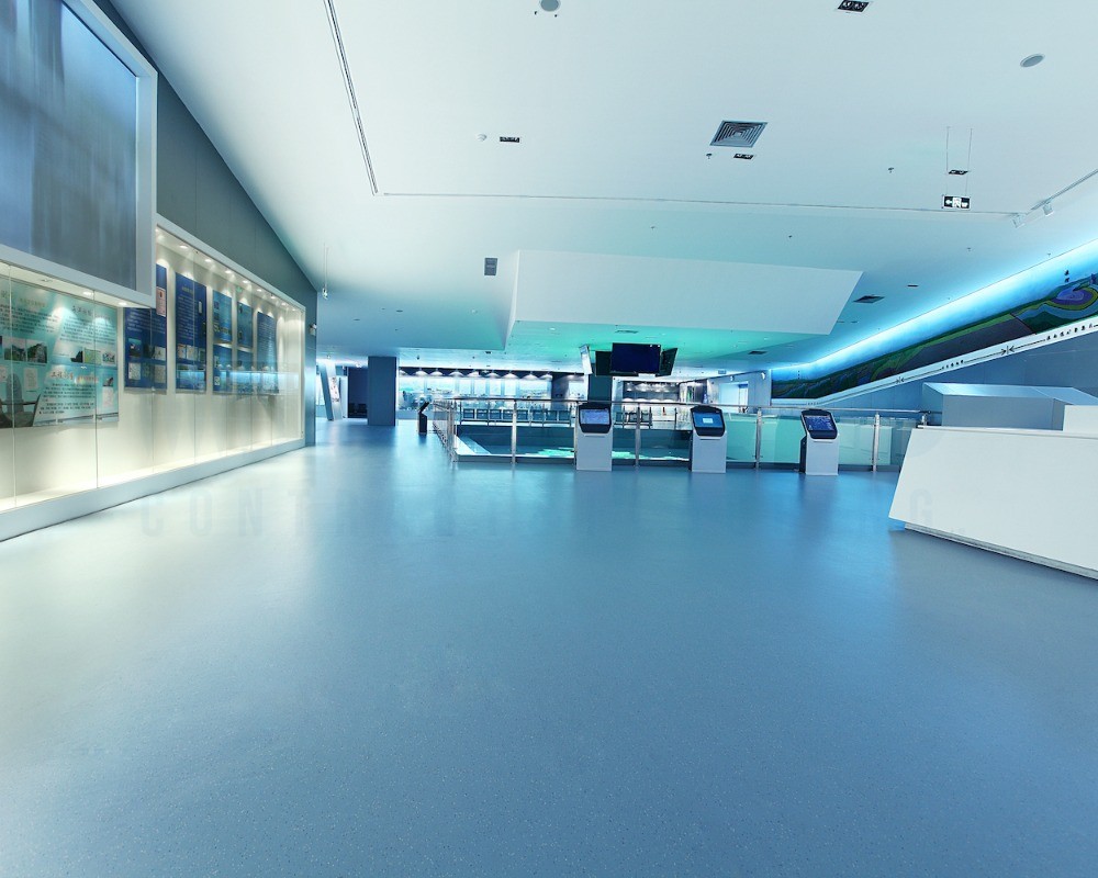 浅蓝色地面贯穿馆内主要参观动线,整体铺装效果平整,满足了博物馆对地面系统在静音、耐用、易维护及空间协调性方面的基本功能需求。