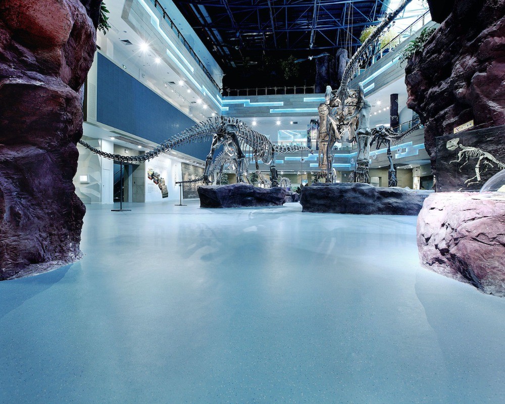 “盟多铺设了3mm厚的Futura多特系列橡胶地板,铺装面积为3000平方米。地面采用浅蓝色,与馆内古生物化石展陈主题及空间色调形成视觉协调。”