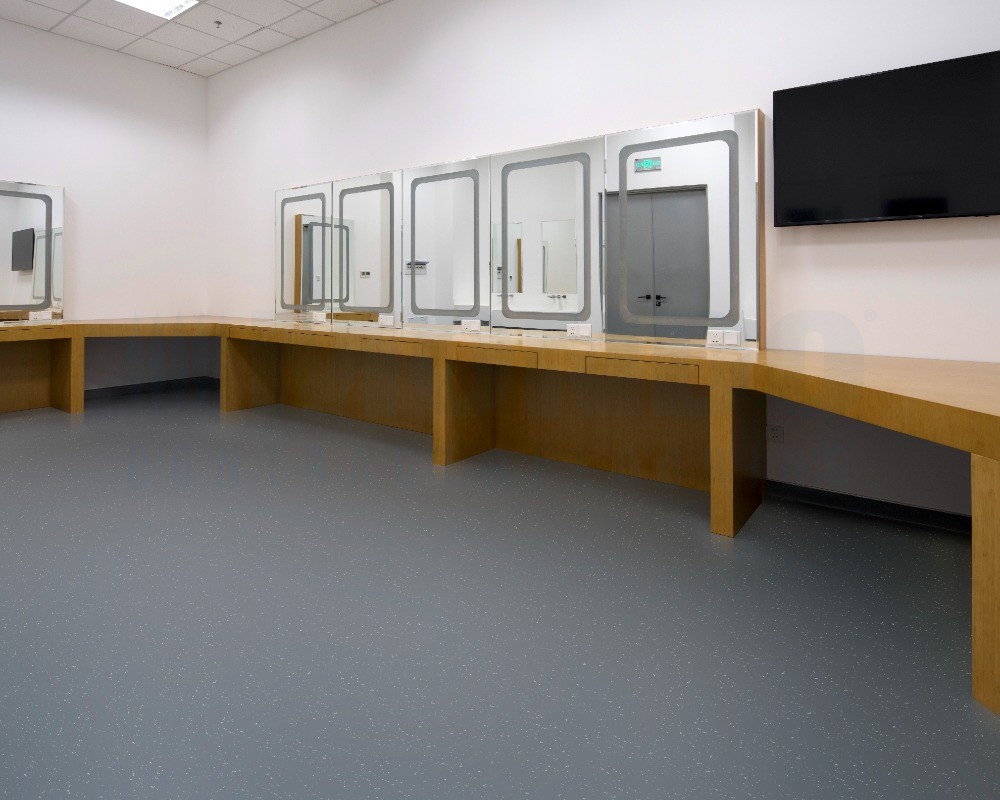 盟多地板PUNTI多昂使用于南通大剧院走廊、候场区与化妆间。作为盟多橡胶地板的经典系列,PUNTI多昂出众的产品性能和经典配色,使之经久不衰。在南通大剧院应用的PUNTI多昂PL110西塞灰,以典雅的灰色为基底,点缀明亮的黄和富有生机的绿,与建筑空间共同营造高雅艺术感。